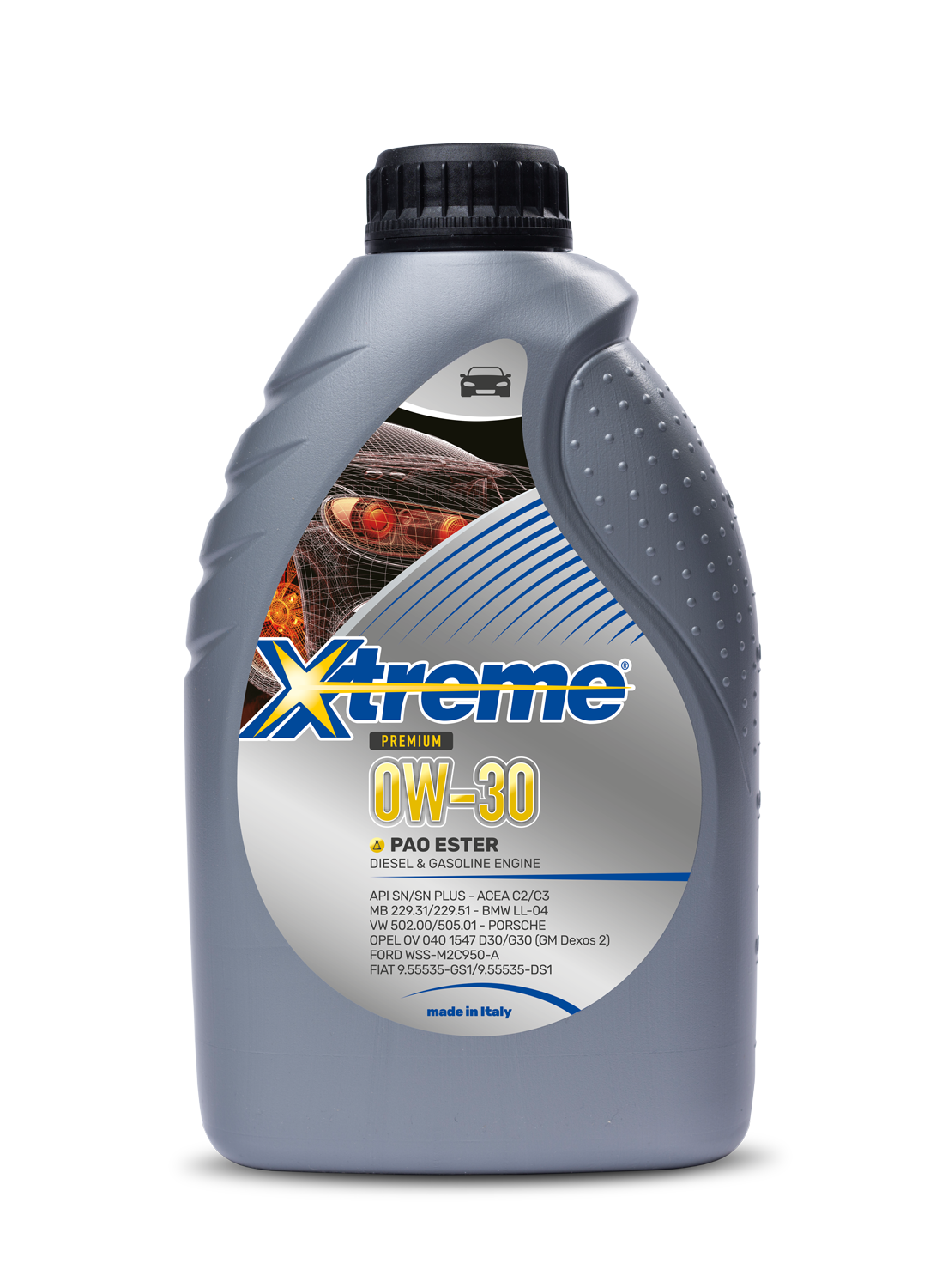 Xtreme Premium 0W30 is a 100% synthetic lubricant made with carefully selected base oils such as PAO (polyalphaolefin) and additives of high technology. It has been formulated to provide exceptional performance in modern gasoline or diesel engines, normally aspirated or turbocharged, of the latest generation. Thanks to the special friction modifiers, this oil provides maximum power to the engine and enhances its speed of response. It also helps to resist to strong thermal stress typical of high–power engines, thus maintaining the highest level of cleaning for very long periods. It also has: