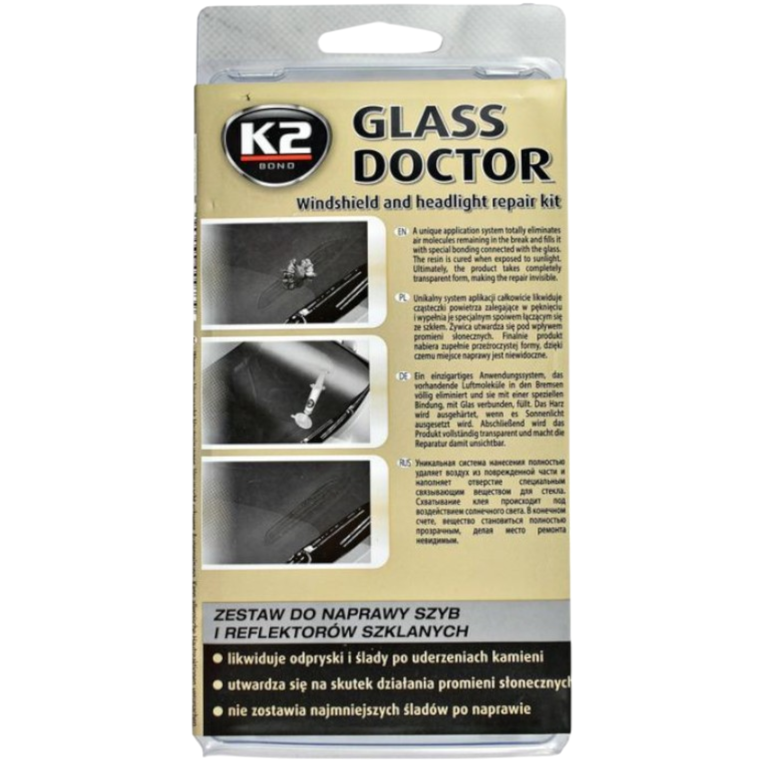 Windschutzscheiben-Reparatursatz - ein professionelles Set zur Wiederherstellung von Windschutzscheiben. Im Gegensatz zu anderen ähnlichen Produkten ist keine ultraviolette Strahlung erforderlich. Das Prinzip des Kits besteht darin, Luft von Spänen und Rissen zu entfernen und diese mit einem starken Harz zu füllen, wodurch der behandelte Bereich des Glases noch stärker als zuvor wird. Um die besten Ergebnisse zu erzielen, sollten Sie Reparaturen so bald wie möglich nach dem Schaden durchführen. Bevor der abgebrochene oder rissige Bereich kontaminiert wird.