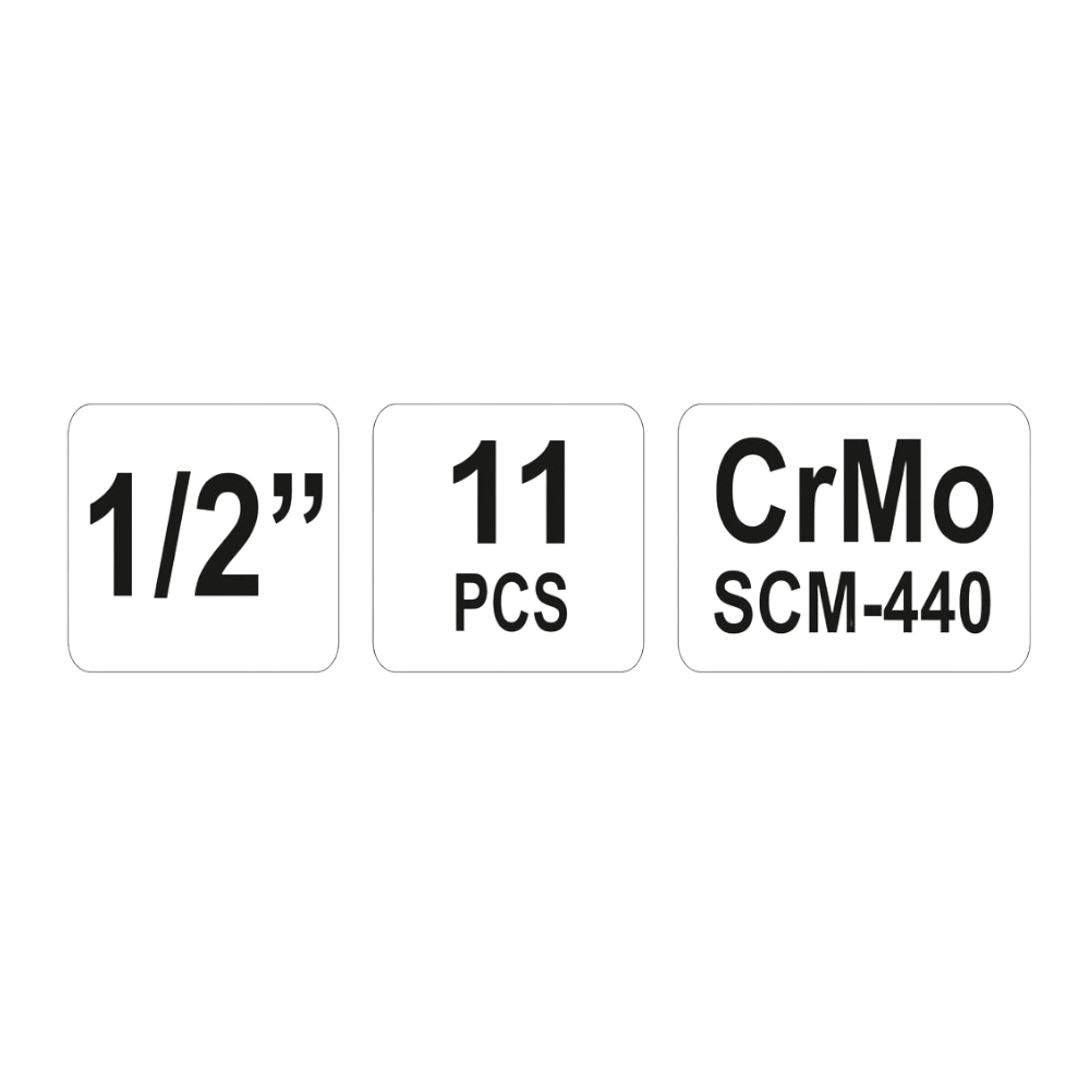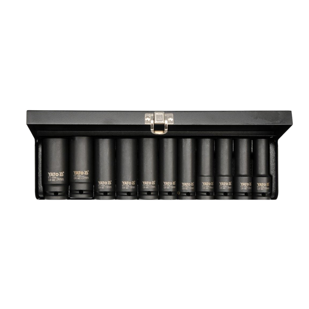 Das Yato YT-1054 Steckschlüssel-Set besteht aus 11 langen Schlagschrauber-Einsätzen mit 1/2-Zoll-Antrieb, speziell für den Einsatz mit pneumatischen Werkzeugen unter hoher Belastung konzipiert. Die Einsätze bestehen aus hochwertigem CrMo SCM-440-Stahl, der eine hohe Zugfestigkeit sowie Stoßfestigkeit bietet und so die Lebensdauer bei starker Beanspruchung erhöht. Das integrierte AS-DRIVE-System verhindert das Abrunden oder Blockieren von Muttern. Ideal für professionelle Anwendungen im Kfz- und Reifenservice.
