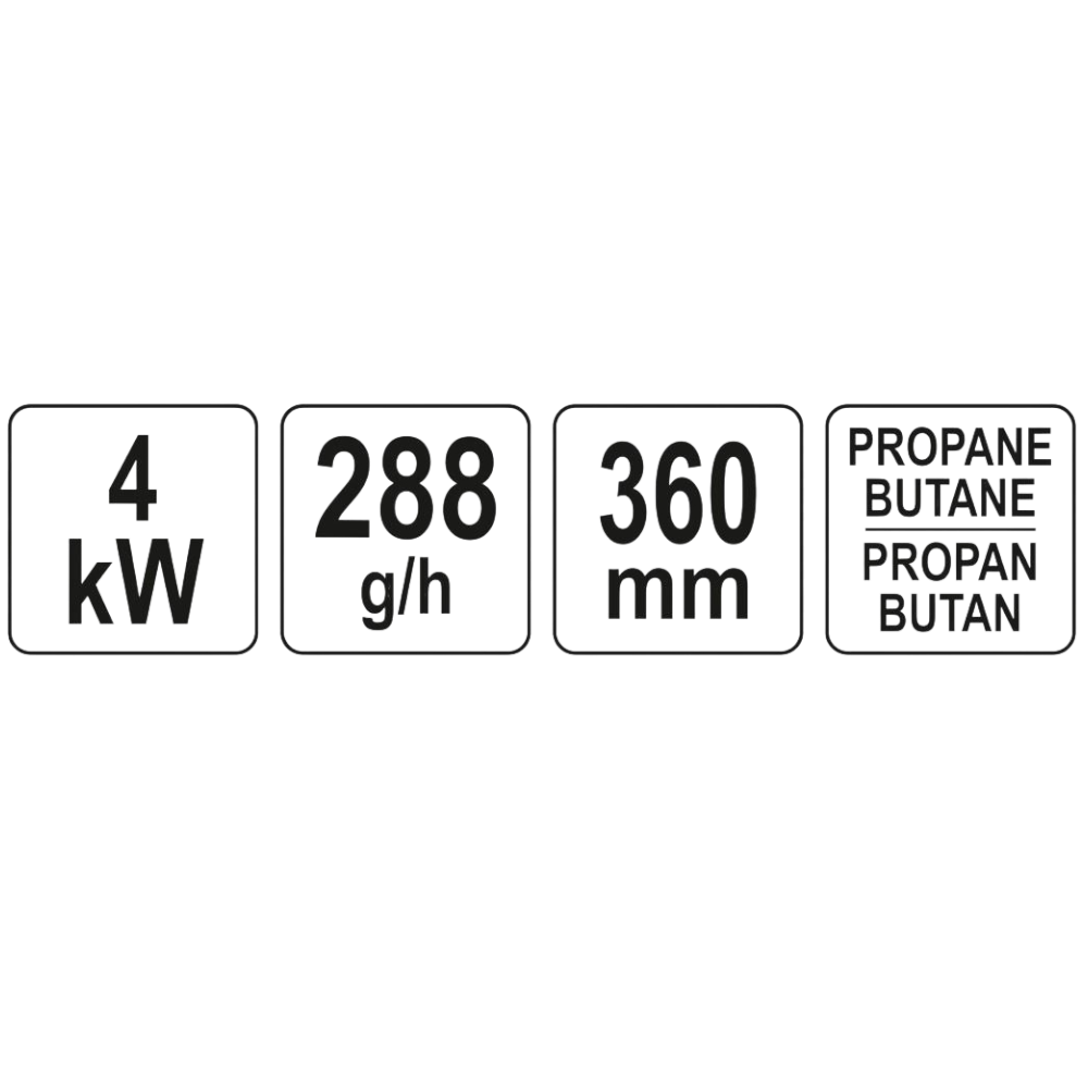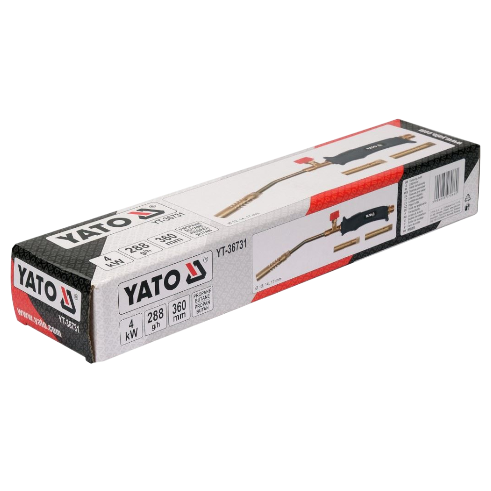 Der YATO YT-36731 ist ein 360 mm langer Gaslötbrenner mit drei austauschbaren Runddüsen aus Messing (Ø 17/14/13 mm), geeignet für Arbeiten wie Erhitzen, Brennen und Löten. Der Gasfluss wird über ein Ventil mit Drehknopf reguliert. Der Griff besteht aus hartem, isolierendem Kunststoff für sicheres Handling. Der Anschluss erfolgt über ein 16-mm-Gewinde für Gasschläuche.