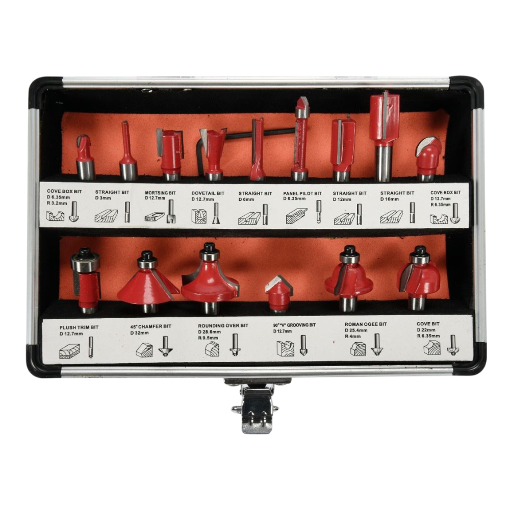 Das Set ist für die Verwendung mit Fräsmaschinen geeignet, die über ein 8-mm-Spannfutter verfügen. Es wird in einer praktischen Box geliefert und enthält zusätzlich einen Inbusschlüssel.
