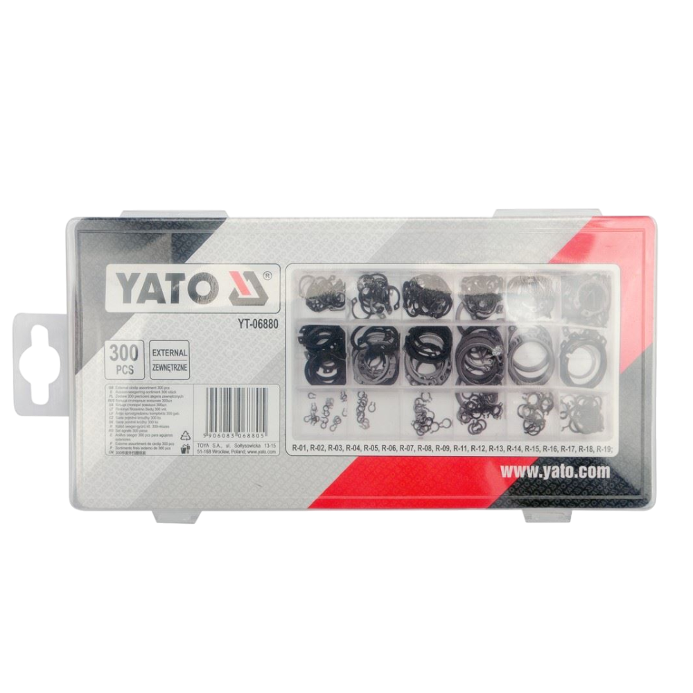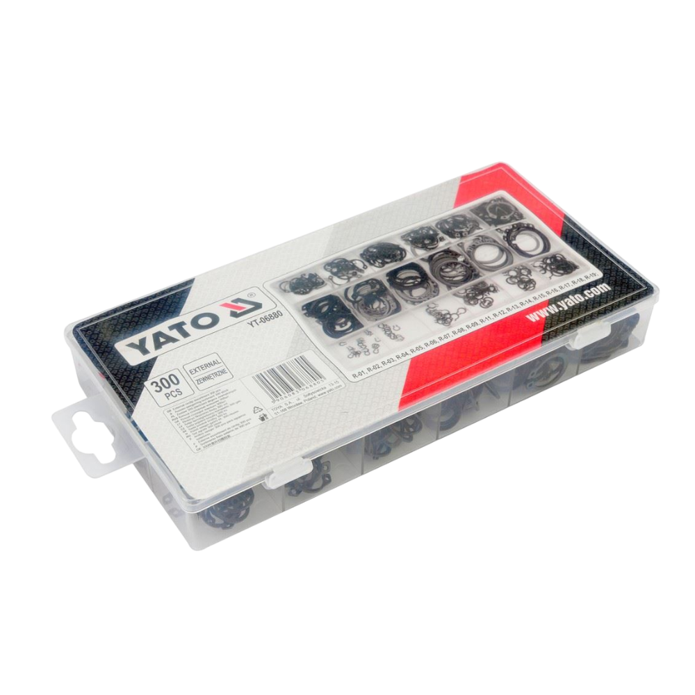 Das Yato YT-06880 Sicherungsring-Set enthält 300 externe Seeger-Ringe in verschiedenen Größen und ist für professionelle Anwendungen in Werkstätten und der Industrie geeignet. Die Ringe bestehen aus robustem Manganstahl und entsprechen den Normen DIN 471 und DIN 472. Das Set ist ideal zur Sicherung von Wellen und anderen Bauteilen und wird in einer praktischen Aufbewahrungsbox geliefert.