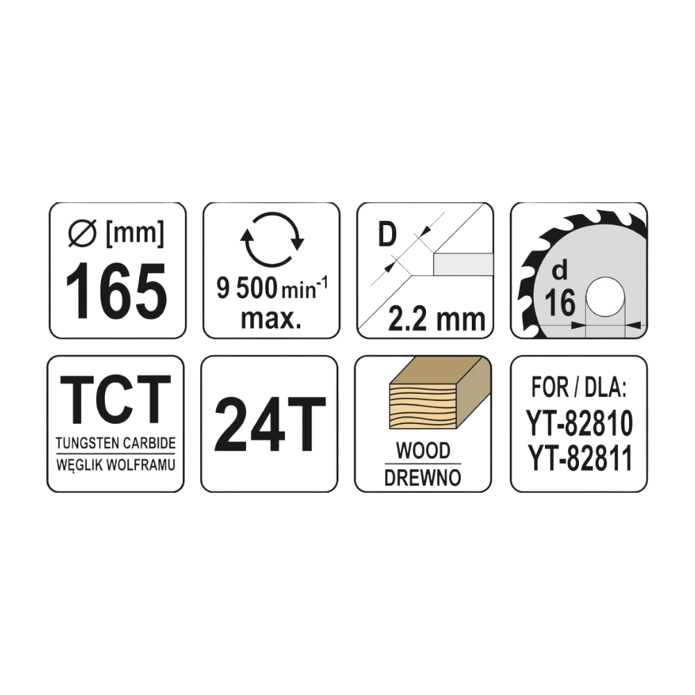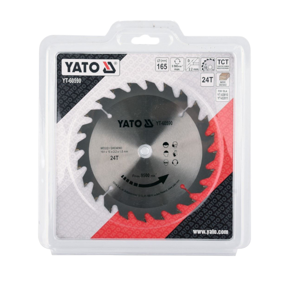 Dieses TCT-Kreissägeblatt mit 165 mm Durchmesser und 24 Zähnen ist für grobe bis mittlere Schnitte in Holz und Holzwerkstoffe geeignet. Es verfügt über eine 16-mm-Bohrung, eine Schnittbreite von 2,2 mm sowie eine Blattdicke von 1,5 mm. Die maximale Drehzahl beträgt 9 500 min⁻¹.