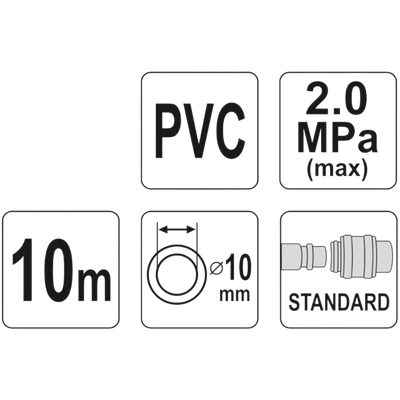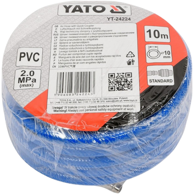 Professioneller verstärkter Pneumatikschlauch mit Schnellverbindern. Druckluftschlauch mit 10 mm Innendurchmesser, 10 Meter lang, aus verstärktem PVC. Der Schlauch ist kälte- und hitzebeständig und kann daher auch außerhalb der Werkstatt eingesetzt werden. Es ist ein unverzichtbares Werkzeug in jeder Werkstatt oder Produktionsstätte.
