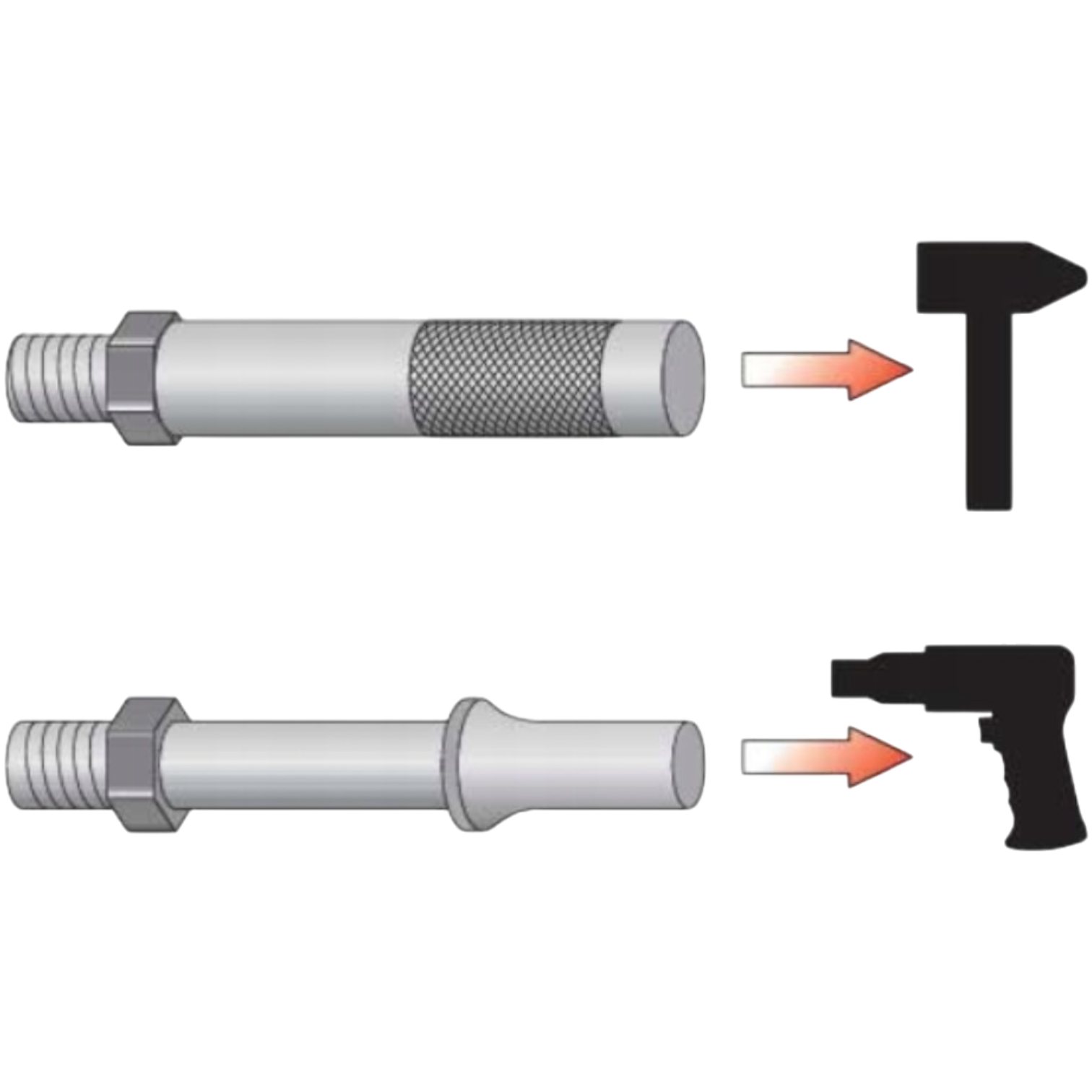 Ein praktischer Spurstangenabzieher-Satz bestehend aus drei Gabeln und anschraubbaren Griffen , wobei einer zum Schlagen mit einem Handhammer , der andere zum Schlagen mit einem Presslufthammer dient .