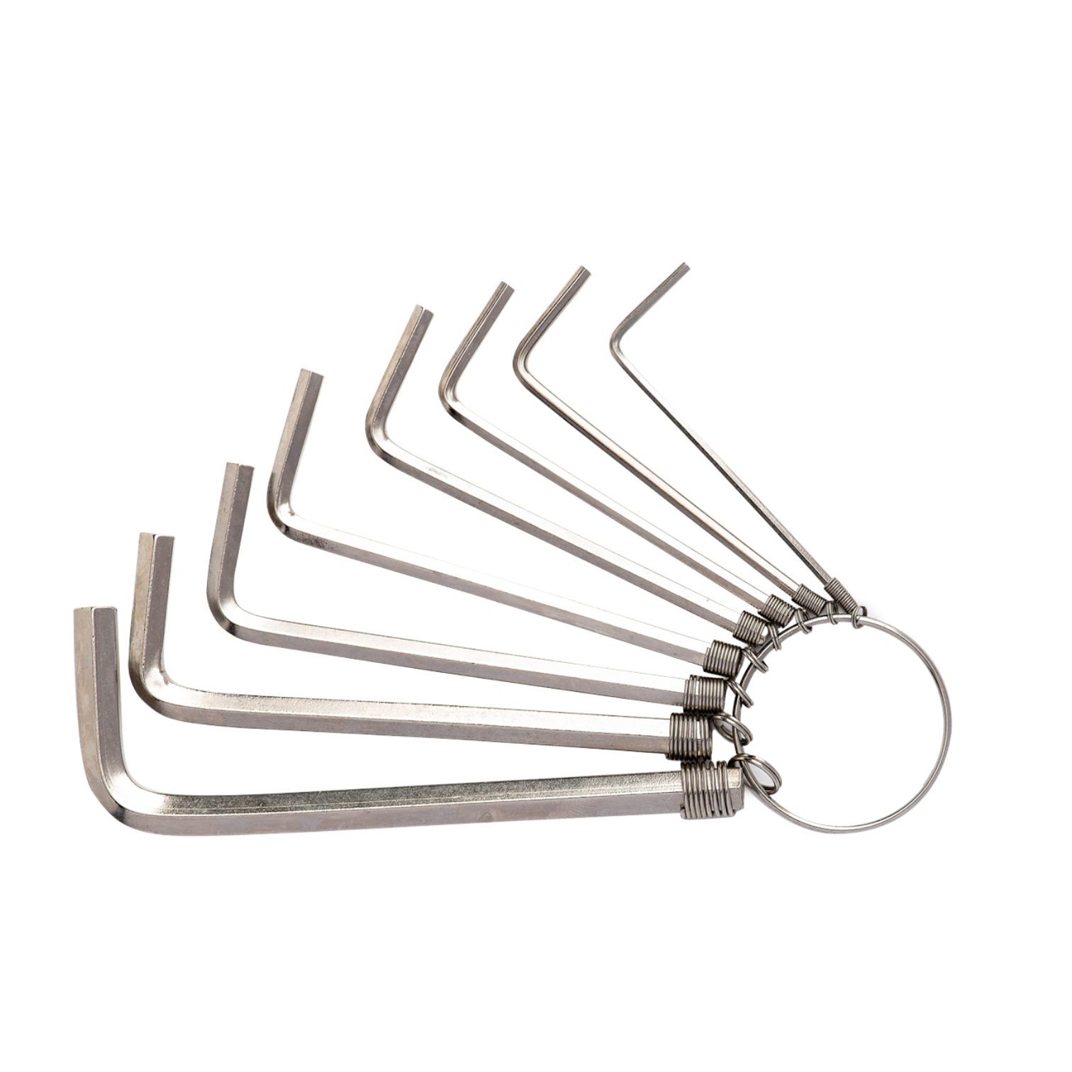Set mit 6 Sechskantschlüsseln in verschiedenen Größen. Der im Set enthaltene Ring erleichtert die Aufbewahrung und den Transport der Werkzeuge und schützt sie gleichzeitig vor Verlust.