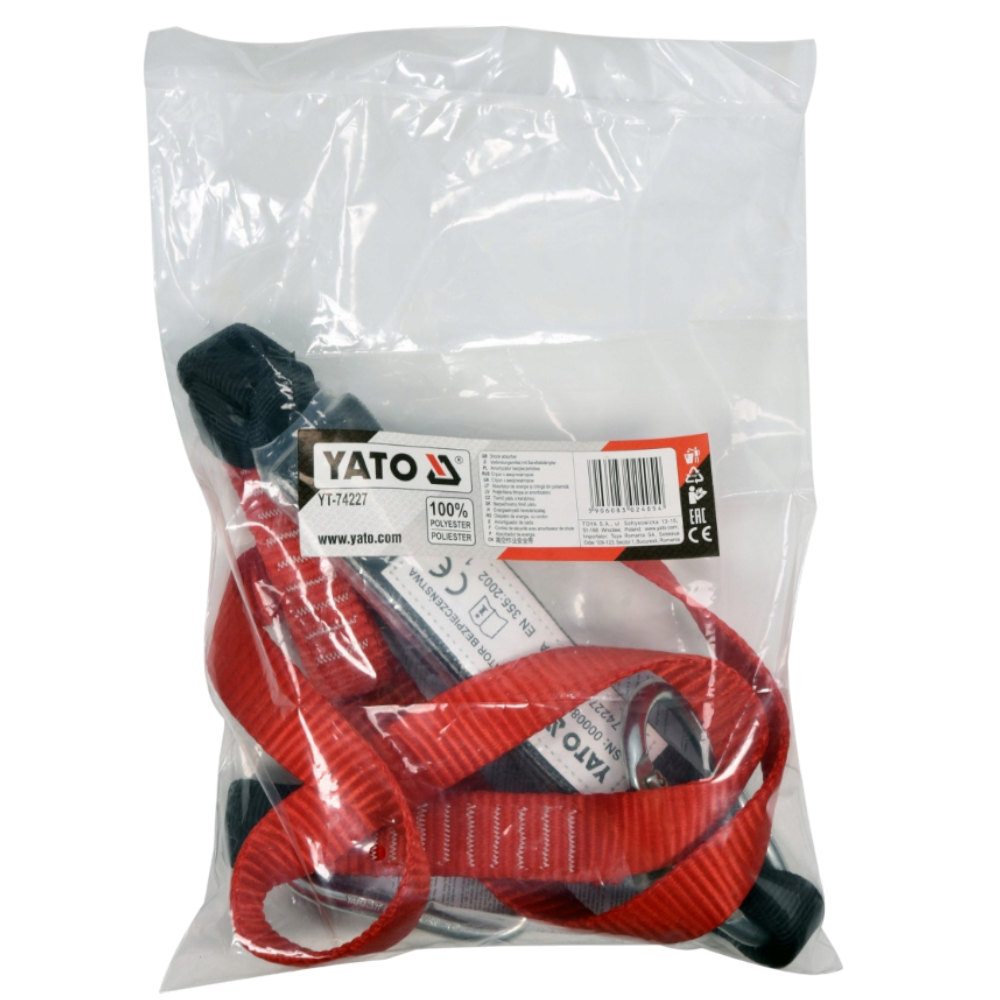 Der YATO YT-74227 Sicherheitsstoßdämpfer ist ein Bestandteil eines persönlichen Auffangsystems für Arbeiten in der Höhe. Er besteht aus einem 1,8 m langen Polyestergurtband (30 mm breit) mit zwei fest verbundenen, selbstsichernden Karabinern (max. Öffnung: 16 mm). Die speziell vernähten Nähte des Dämpfungselements lösen sich im Falle eines Sturzes kontrolliert auf, um die Fallenergie zu reduzieren.