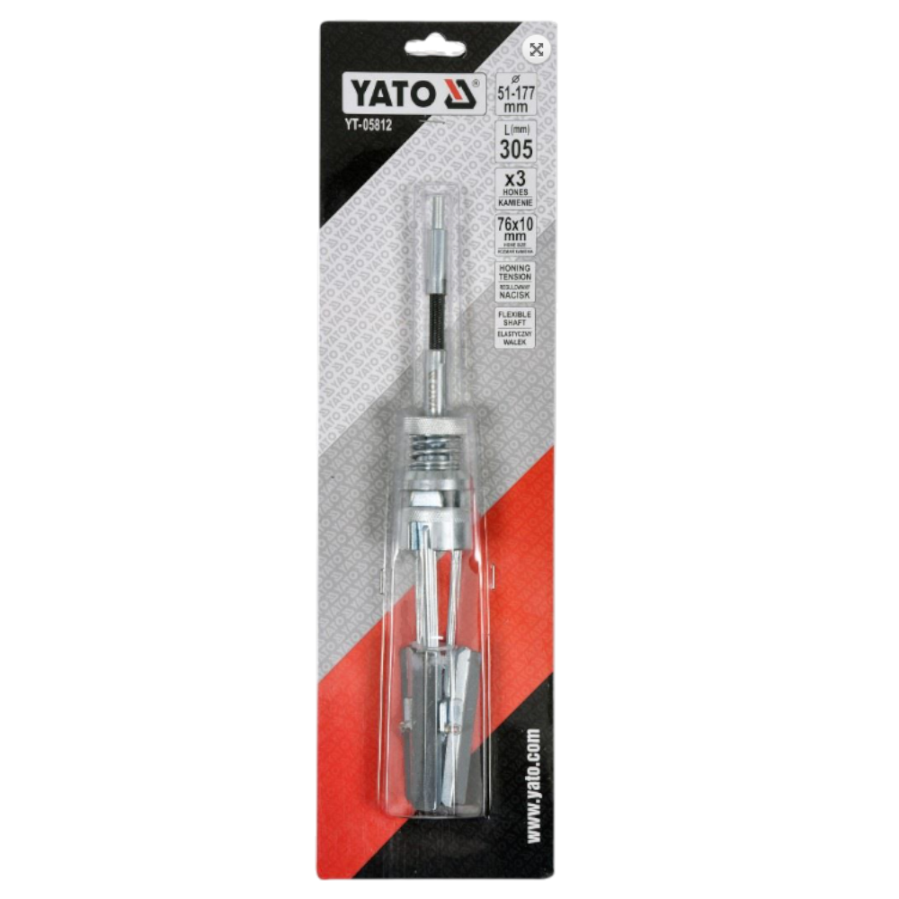 Die Yato YT-05812 Zylinderhonmaschine ist für das Honen von Zylindern mit einem Durchmesser von 51 bis 177 mm ausgelegt. Sie verfügt über eine flexible Welle zur besseren Anpassung an die Zylinderbohrung und einen verstellbaren Anpressdruck der Schleifsteine. Die drei mitgelieferten Honsteine (76 × 10 mm) sind austauschbar; passende Ersatzsteine sind unter der Bezeichnung YT-05817 erhältlich. Die Gesamthöhe der Honmaschine beträgt 305 mm.