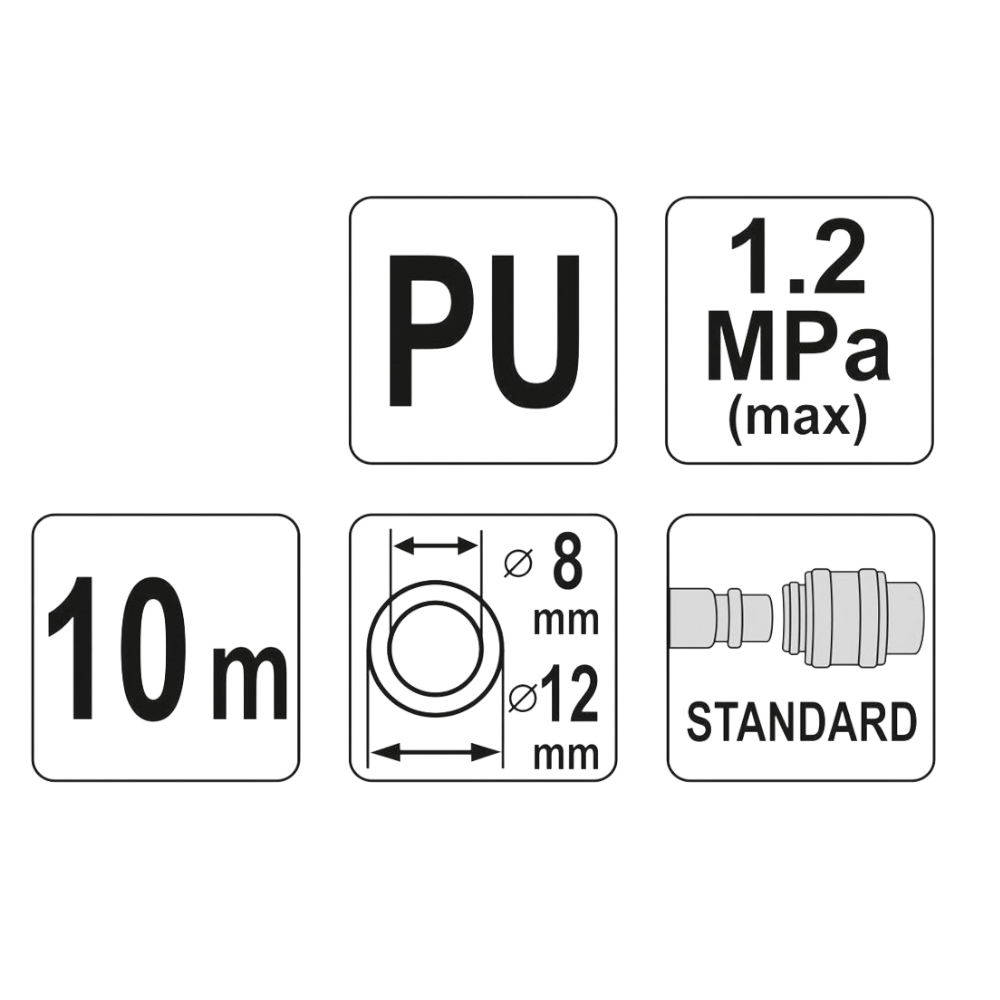Der PU-Spiralschlauch YT-24208 von YATO ist ein 10 Meter langer Druckluftschlauch mit vormontierten Schnellkupplungen. Gefertigt aus widerstandsfähigem Polyurethan, ist er für hohe und niedrige Temperaturen geeignet und besonders platzsparend durch seine Spiralform. Ideal für den professionellen Einsatz in Werkstatt und Industrie.