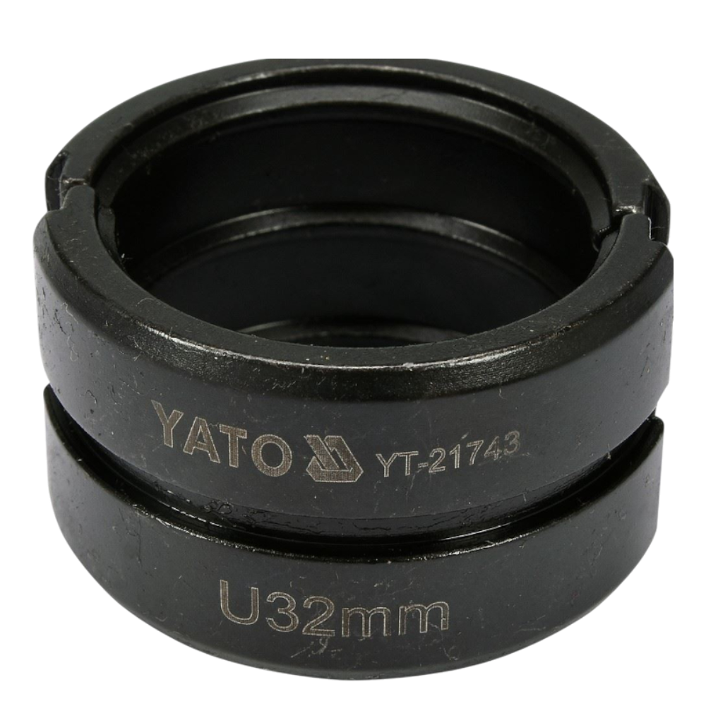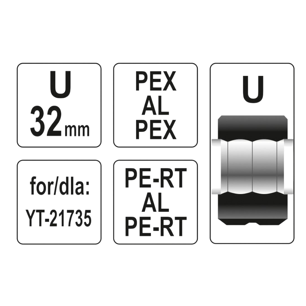 Die Ersatzmatrize YT-21743 dient zum Verpressen von 32-mm-U-Rohrverschraubungen. Sie ist geeignet für den Einsatz mit PEX-AL-PEX- oder PERT-AL-PERT-Rohren.