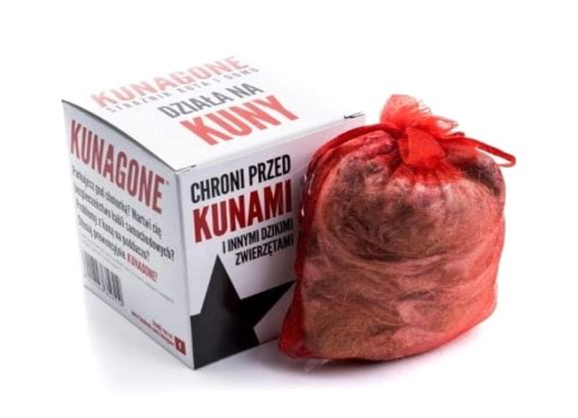 Kunagone ist ein natürlicher Marderschutz für Auto und Haushalt. Kunagone gibt den Geruch des Hundes ab, der wilde Tiere, darunter auch Marder, abschreckt. So können Sie große und teure Schäden vermeiden. Dazu gehören unter anderem durchgebissene Elektrokabel unter der Motorhaube des Autos, Schäden am Dachboden oder der Verlust von Nutztieren (z. B. Hühner, Enten etc.).